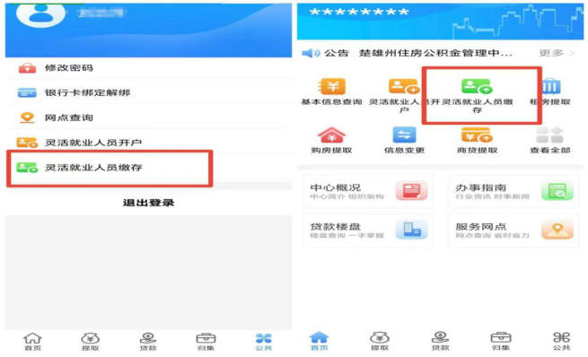 1.微信小程序:首页直接点击“灵活就业人员缴存”或点击“公共→灵活就业人员缴存”。