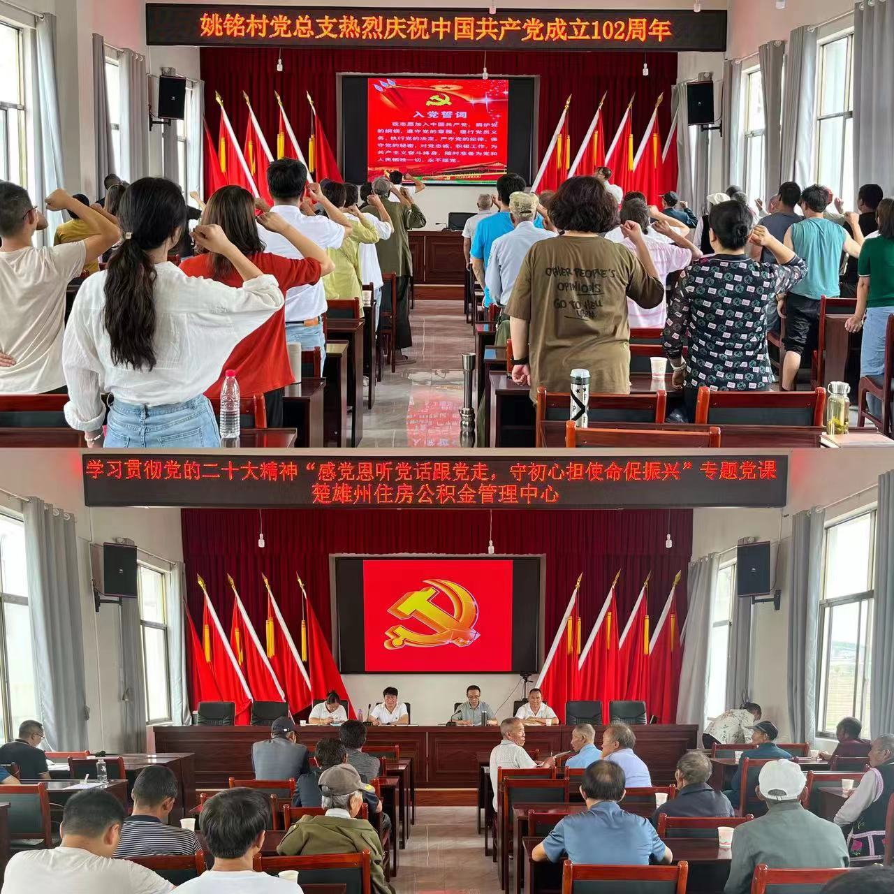 在中国共产党成立102周年活动之际,为深入学习贯彻习近平新时代中国特色社会主义思想和党的二十大精神,进一发挥党建引领助推乡村振兴作用,州公积金中心机关党支部与狮山镇姚铭村党总支互联共建庆祝建党102周年。受州公积金中心党组书记、主任杨柏繁同志委托,党组成员、副主任苏建荣为武定狮山镇姚铭村党总支党员讲授了专题党课。
