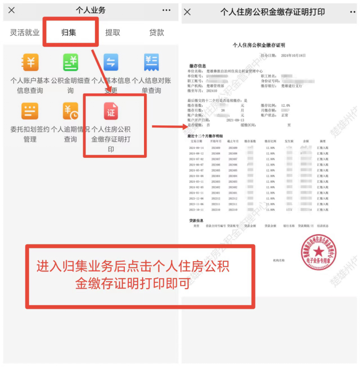 5.个人住房公积金缴存证明打印:进入楚雄州住房公积金管理中心微信公众号→个人中心→个人业务→归集→个人住房公积金缴存证明打印