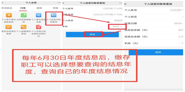 4.个人结息对账单查询:进入楚雄州住房公积金管理中心微信公众号→个人中心→个人业务→归集→个人结息对账单查询